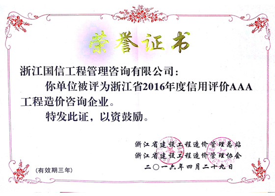 获得浙江省2016年度工程造价咨询3A企业称号